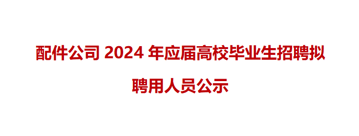 根據(jù)配件公司2024校園招聘實施方案和有關(guān)制度要求,確定付一明等10人(名單附后,以姓名首拼為序) 為我公司擬聘人選,現(xiàn)面向社會進行公示。公示期五天,自2024年5月30日至2024年6月3日止。 監(jiān)督電話: 0551-63689007 來信地址:合肥市蜀山區(qū)臥云路3036號安......