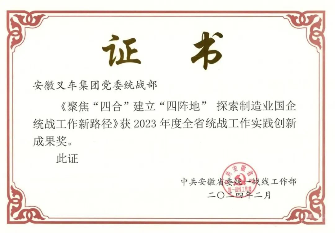 安徽叉車集團榮獲2023年度全省統戰(zhàn)工作實踐創(chuàng)新成果獎!
